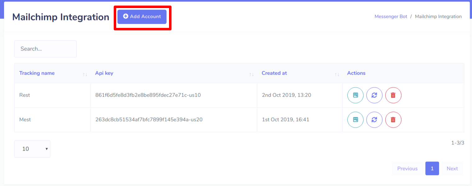 Click the Add Account button. A popup window will appear to put API key and Tracking Name. Please provide your MailChimp account API key and also give a name so that you can recognize it later.