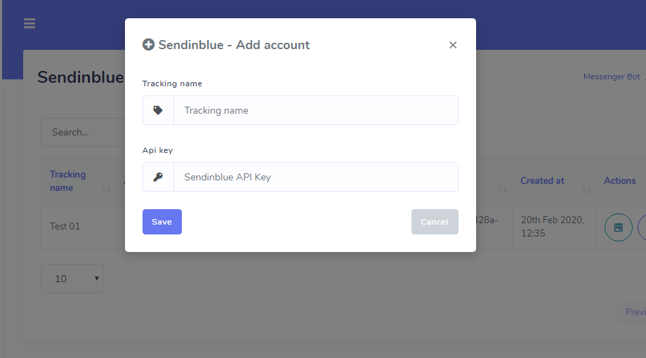 Click the Add Account button. A popup window will appear to put API key and Tracking Name. Please provide your Sendinblue account API key and also give a name so that you can recognize it later.