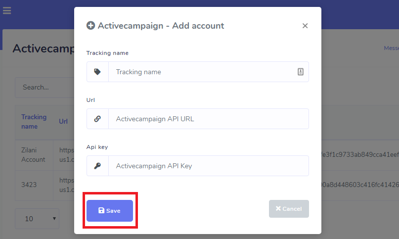 Click the Add Account button. A popup window will appear to put Tracking Name, API URL and API Key. Please provide your ActiveCampaign account’s API URL, API key and also give a name so that you can recognize it later.