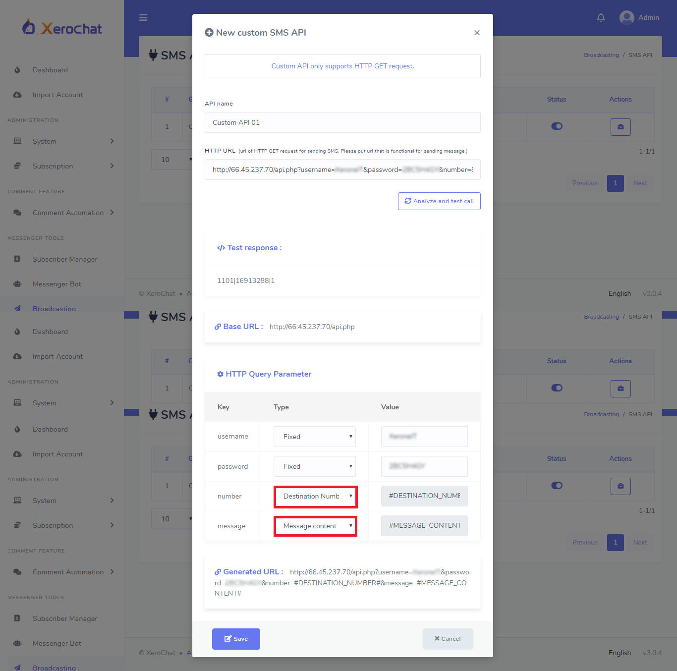 You just have to change the parameter type for Destination Number and Message Content . While changing these parameters type, you will notice that new value has replaced on your newly generated custom API url. When you will send SMS through this custom API then these contents will be replaced by your given contents. - #Step 4